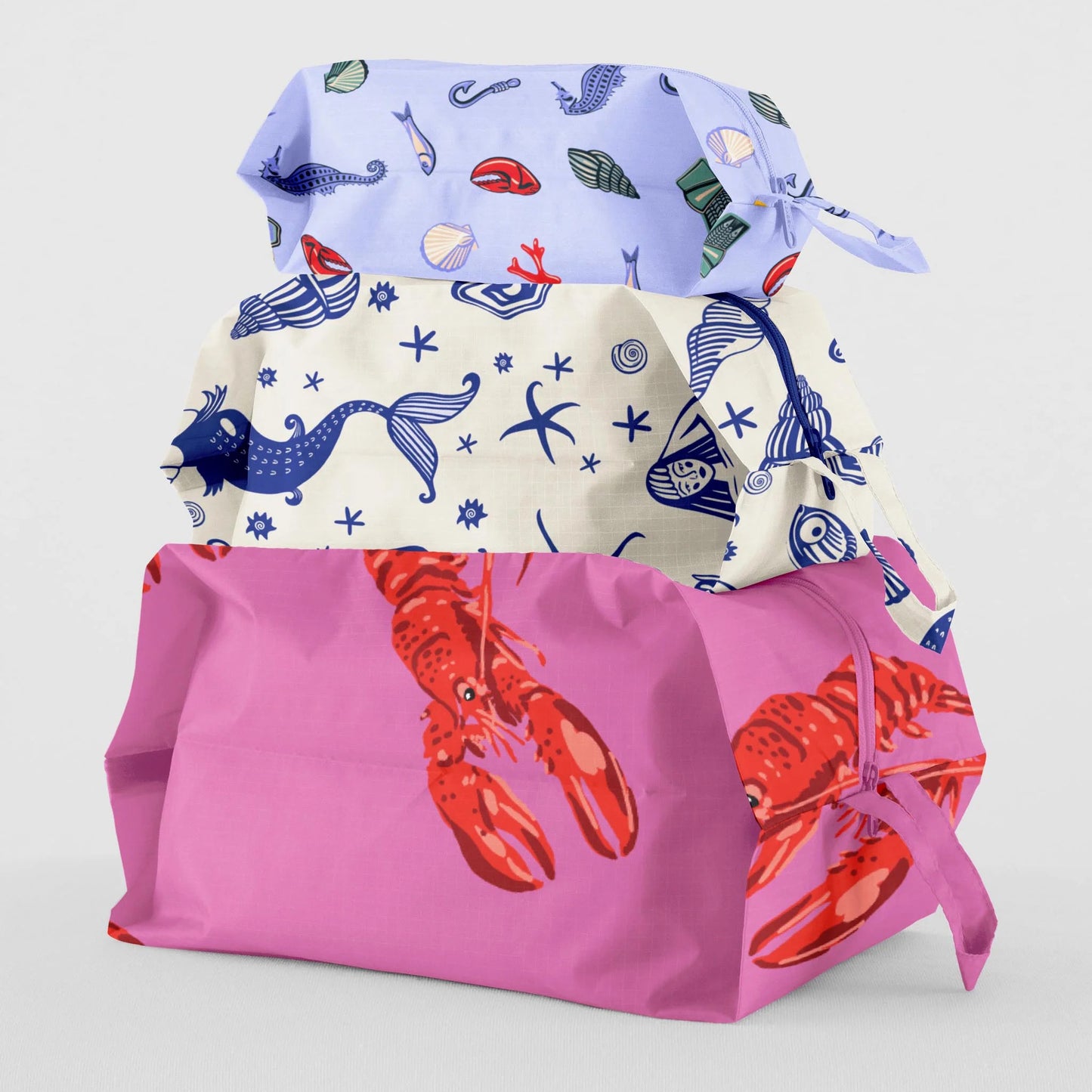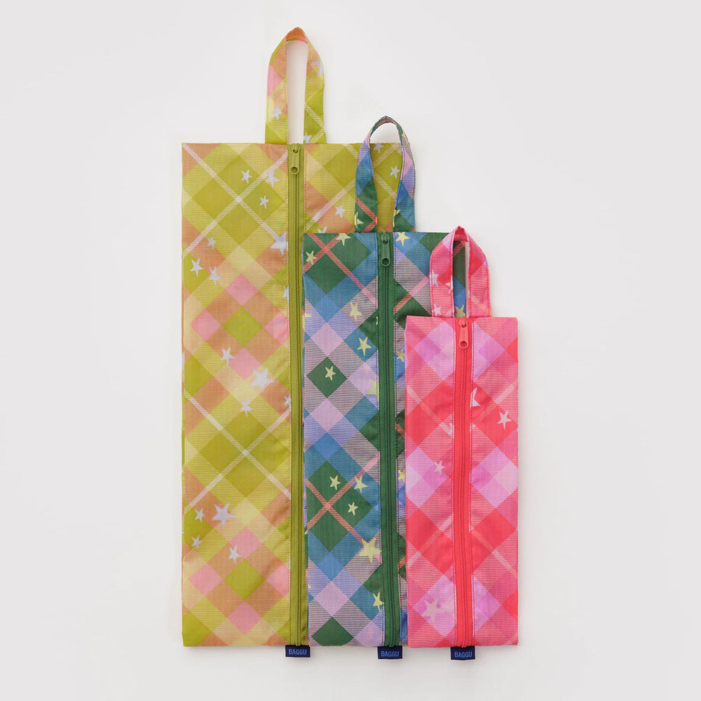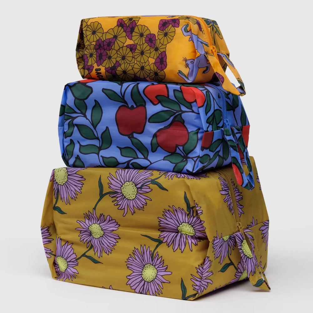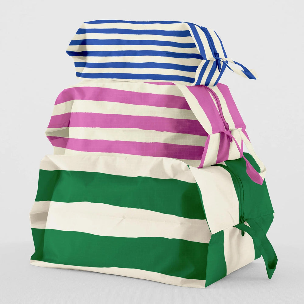 The Go Pouch Set makes it easy to keep your bag neatly packed and organized. Whatever you're toting—coins, cords, or an extra pair of shoes—this set of three all purpose pouches keeps it together. They expand to hold your essentials and lay flat when not in use.