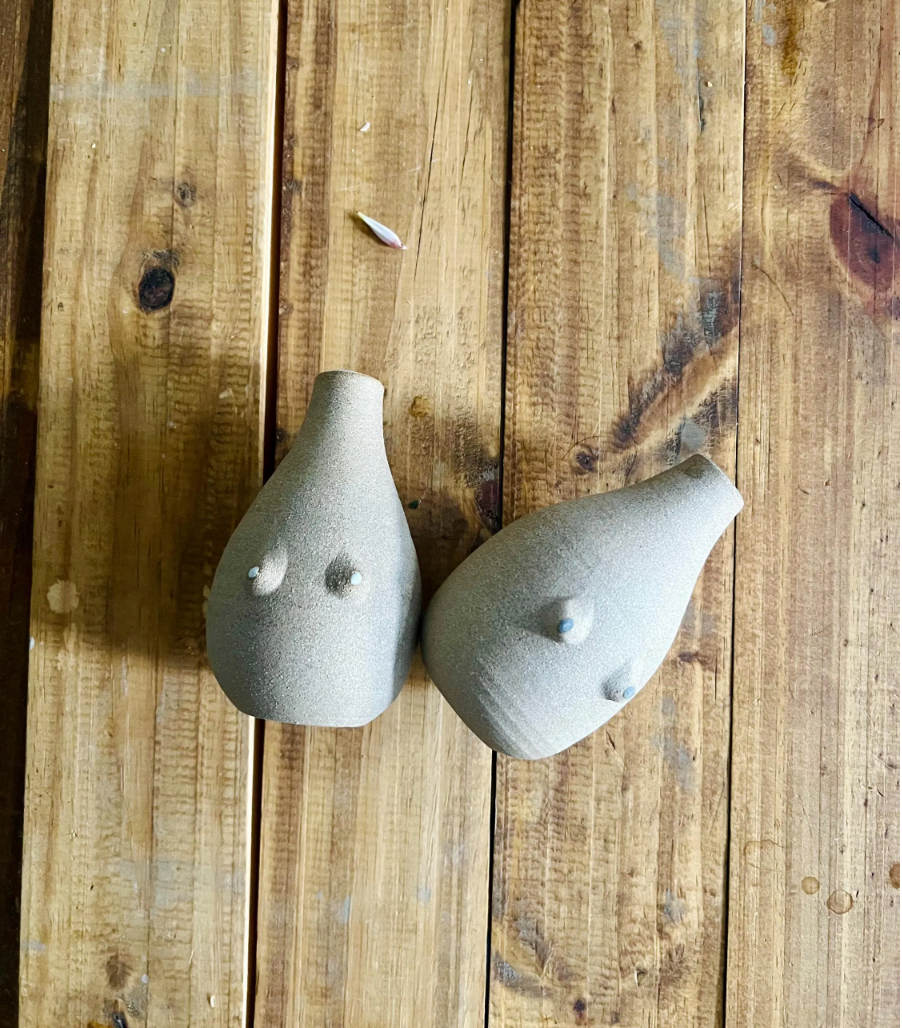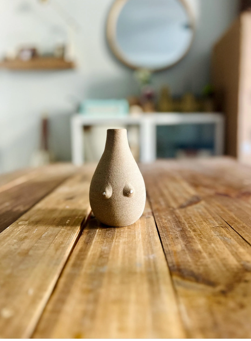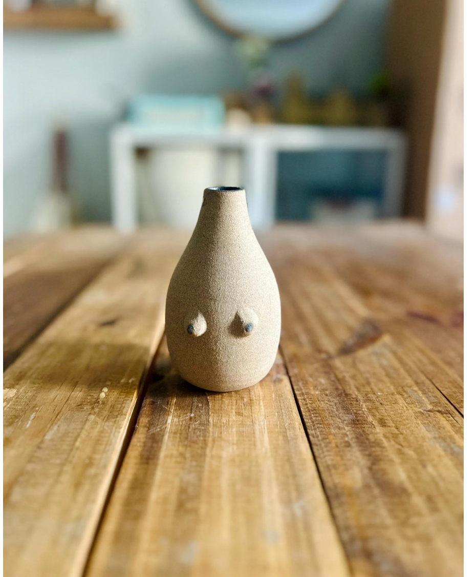 Designed to make you smile, this boobie bud vase is more than decor — it's a celebration of individuality and body positivity. Each vase is wheel-thrown using high-quality stoneware clay, featuring hand-applied boobies (because no two pairs are the same!) and a natural clay exterior. Perfect for a few of your favorite blooms or as a striking addition to shelf.