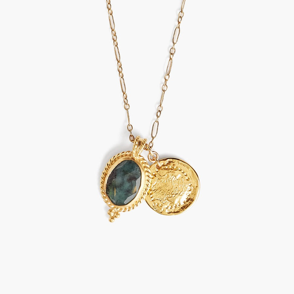 This beautiful charm necklace features a bezel-wrapped emerald pendant and gold coin strung from an 18k gold plated sterling silver chain.