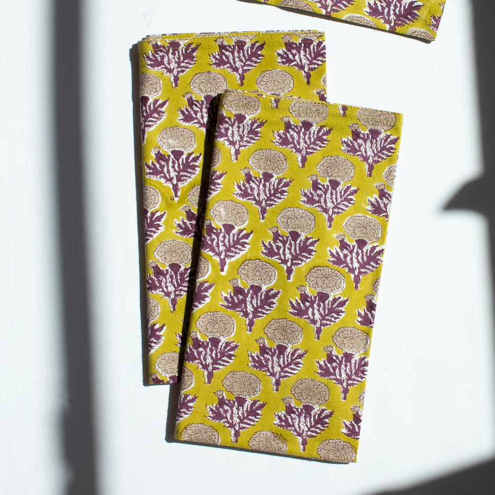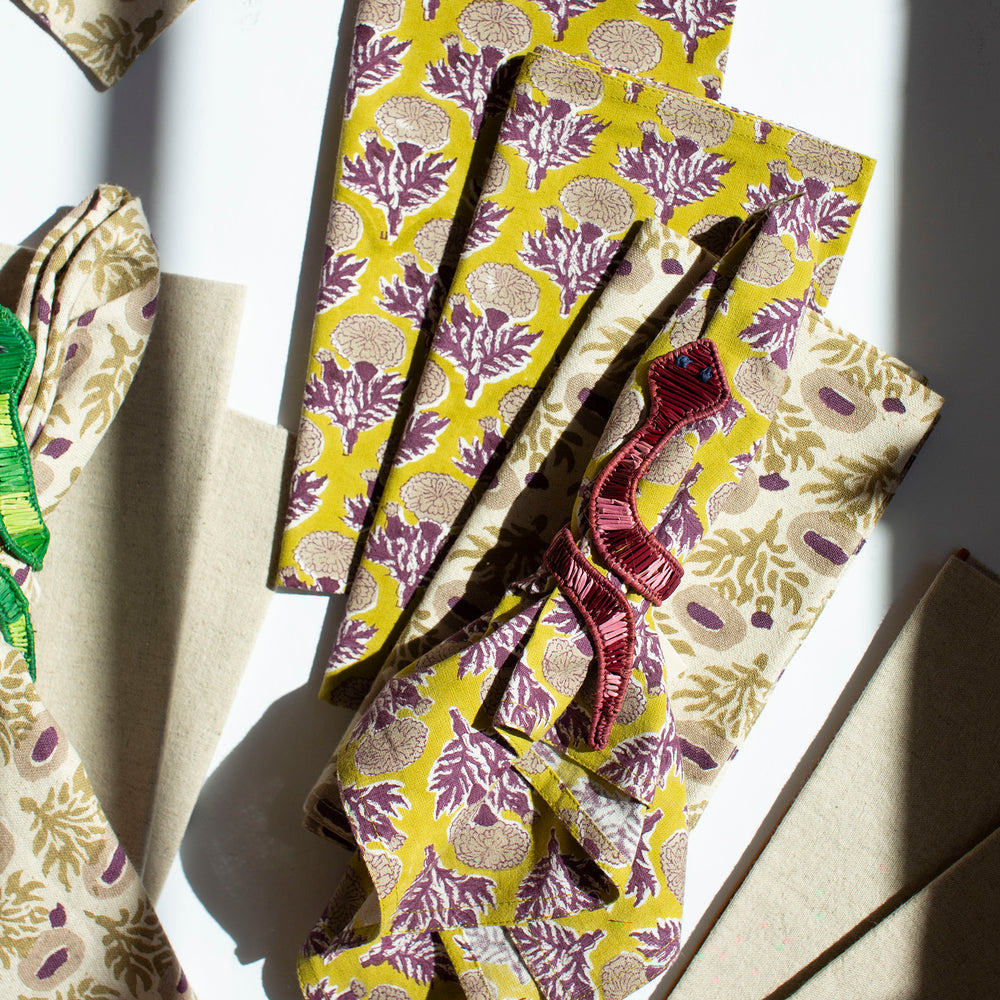 Set the table with eye-catching block printed linen napkins. Inspired by the Royal Gardens of Rajasthan, this collection celebrates flowers like Bougainvillea and Marigolds.