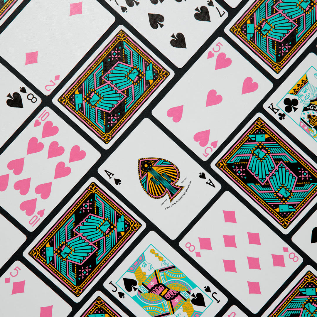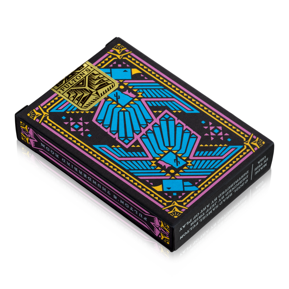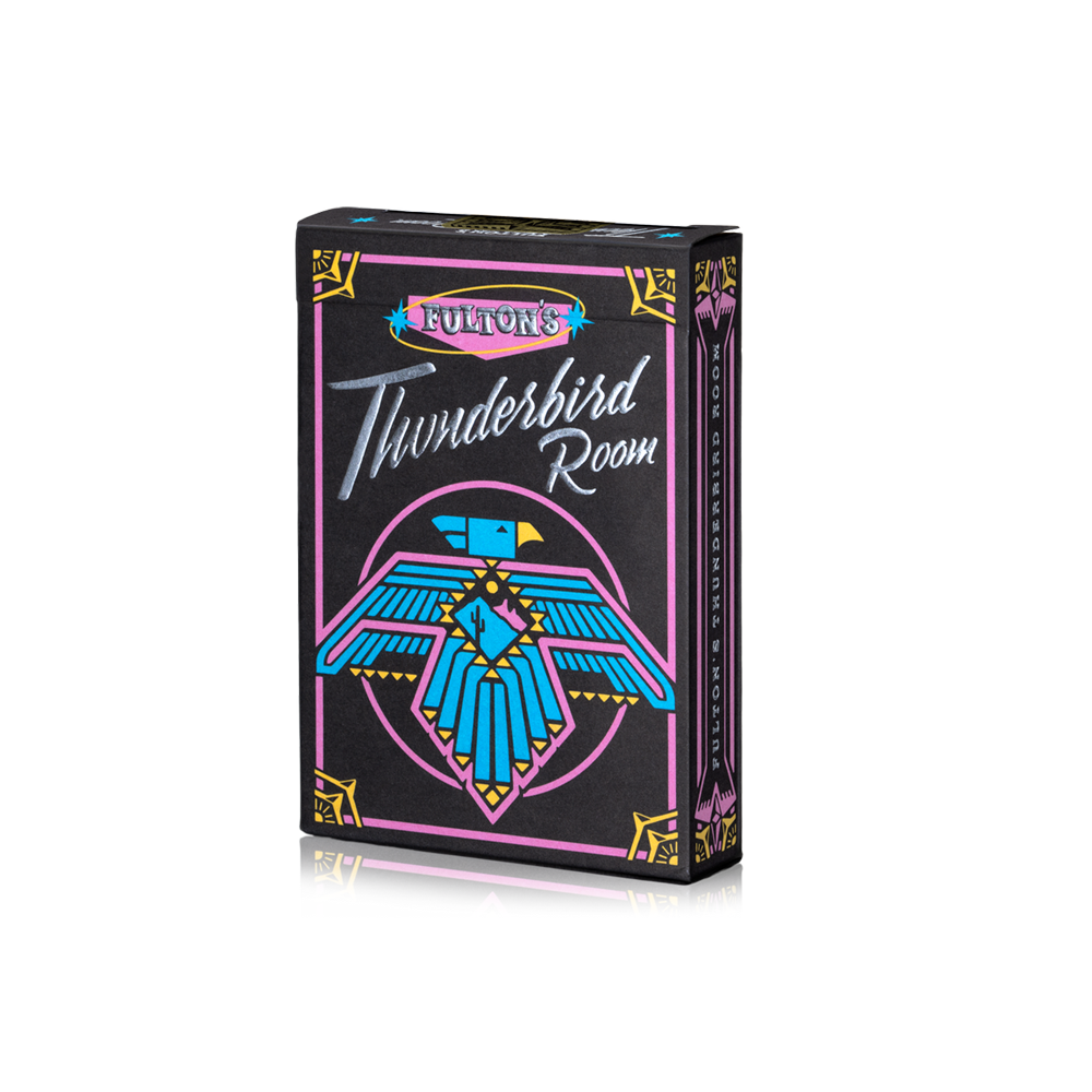 Inspired by the beautiful Arizona Sunsets and a retro color palette of the 60s—Fulton's Thunderbird Room plays out as a masterful casino deck that will instantly take you to the beauty of the Valley of the Sun. Suitable for all games requiring a standard deck.