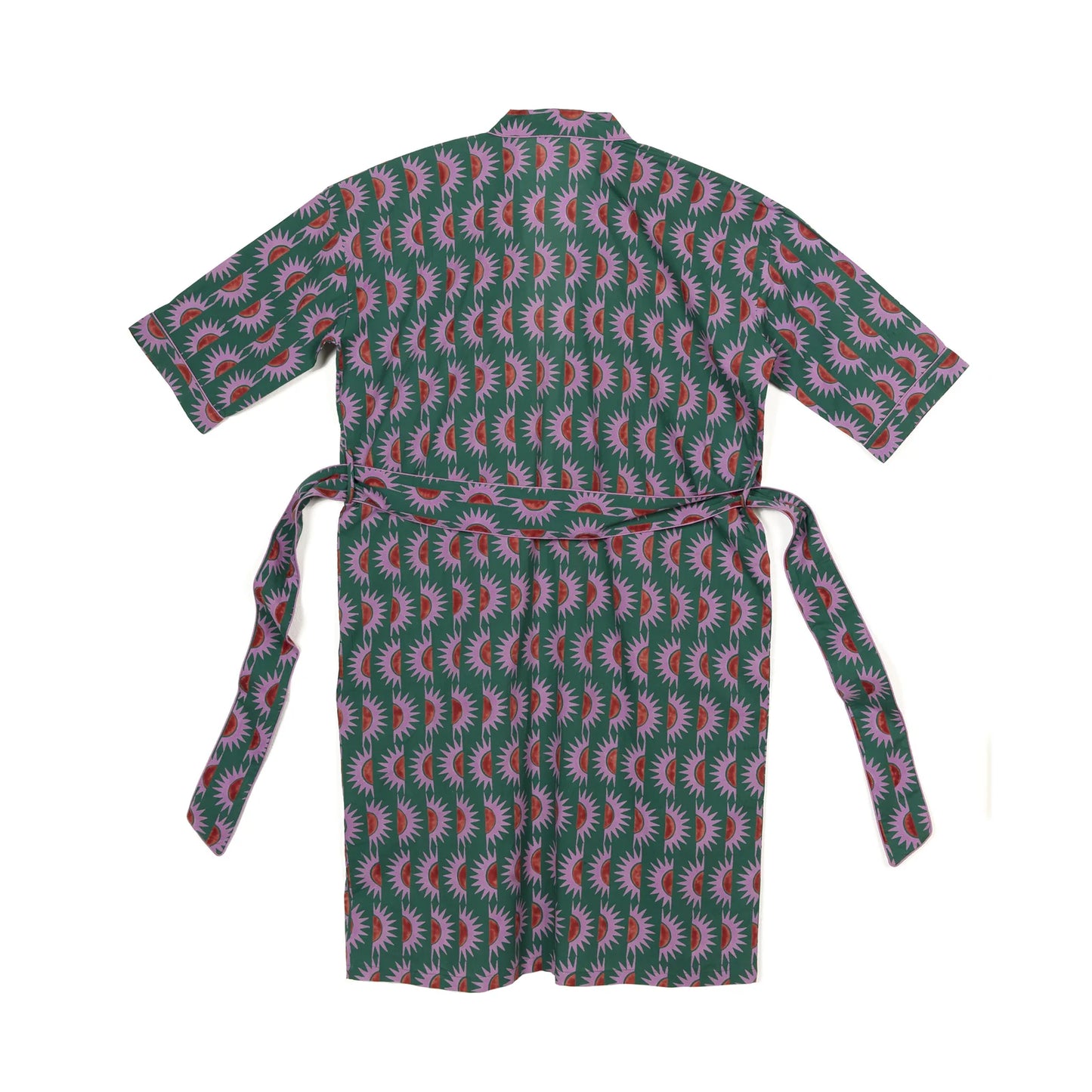 The perfect look for traipsing from your siesta straight to the pool. This elegant, highly wearable robe comes in deep fern green with red and violet details.