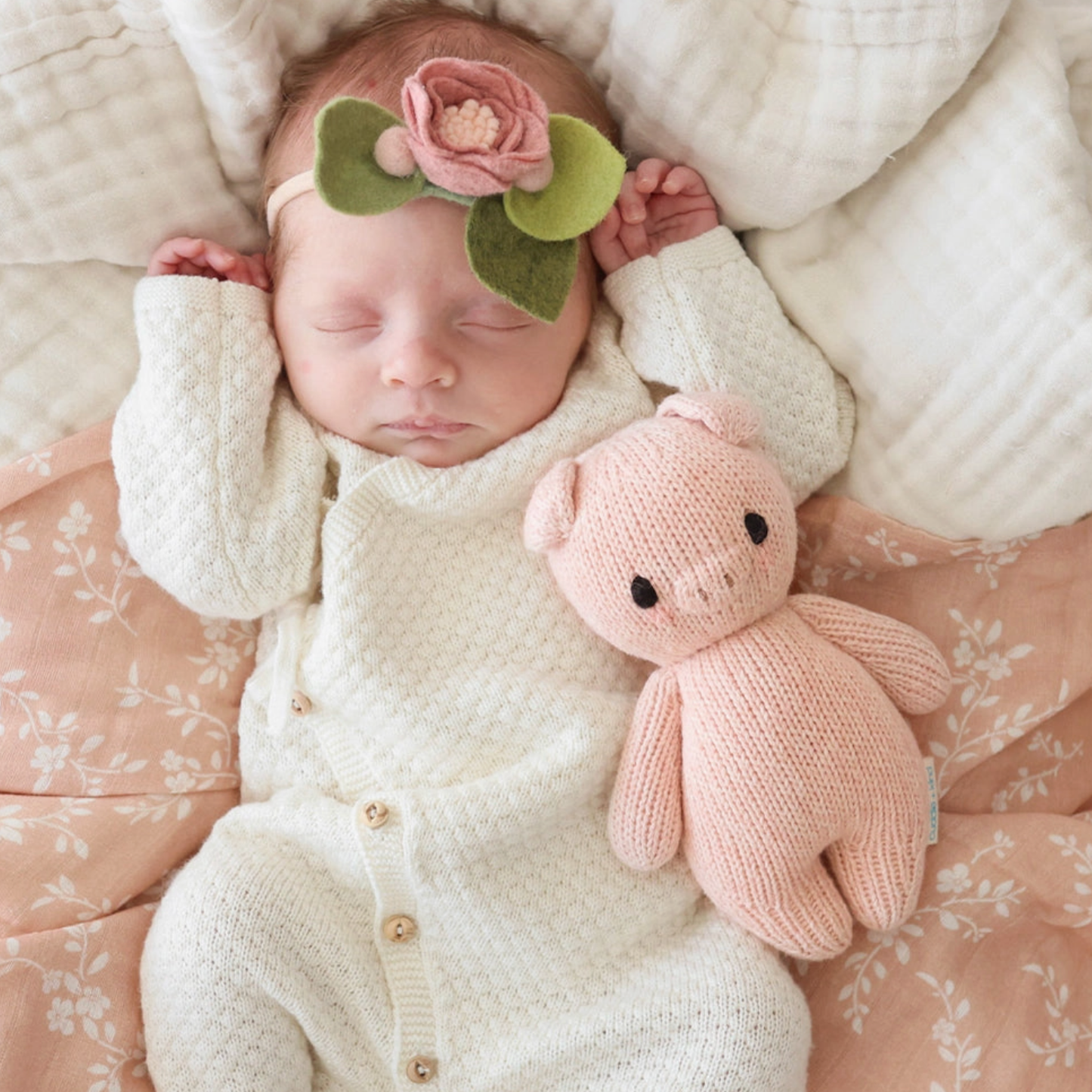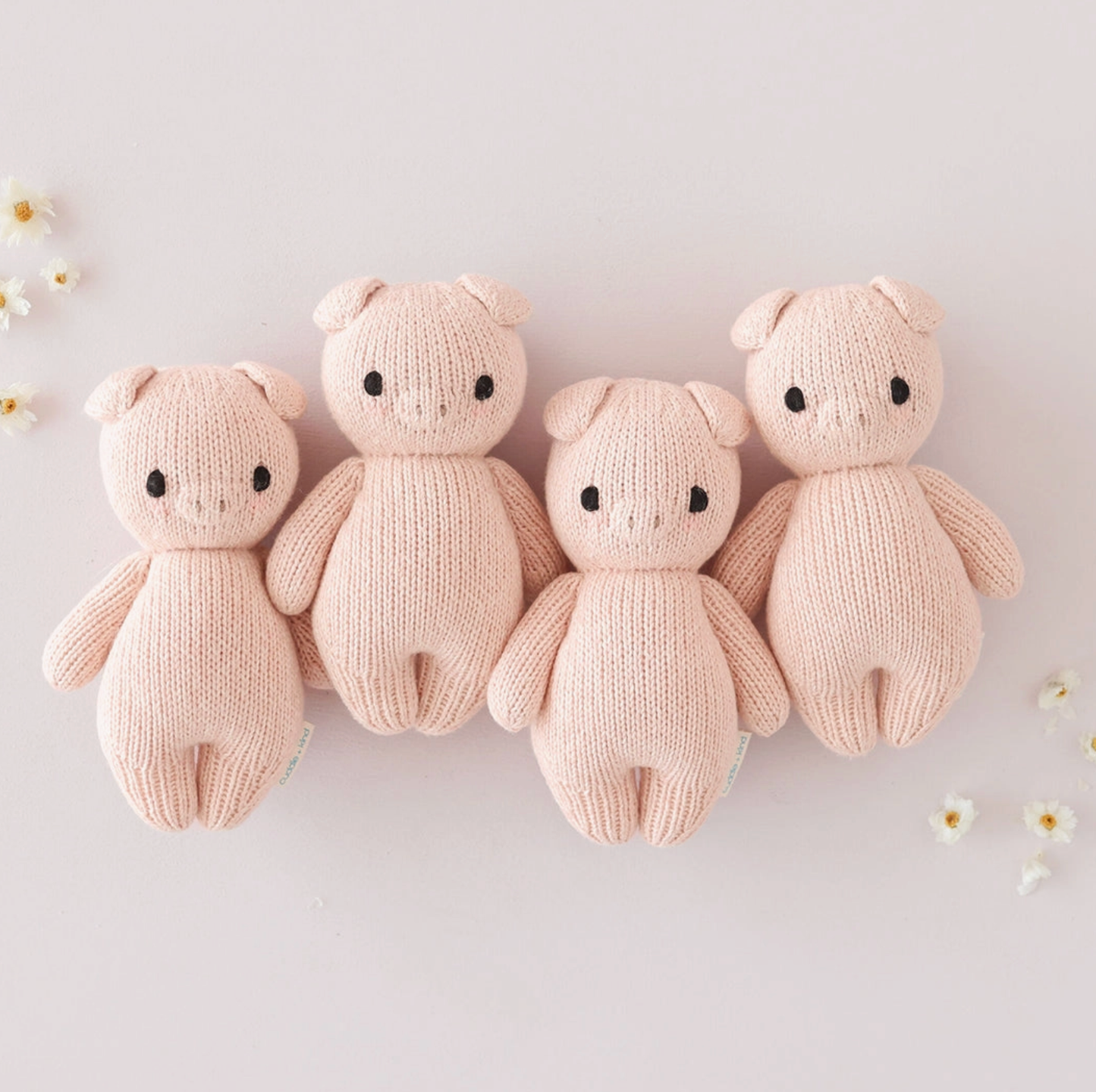 At an endearing seven inches tall, this lovingly hand-knit baby pig is made with 100% cotton yarn and perfectly sized for little hands to grab and hold.