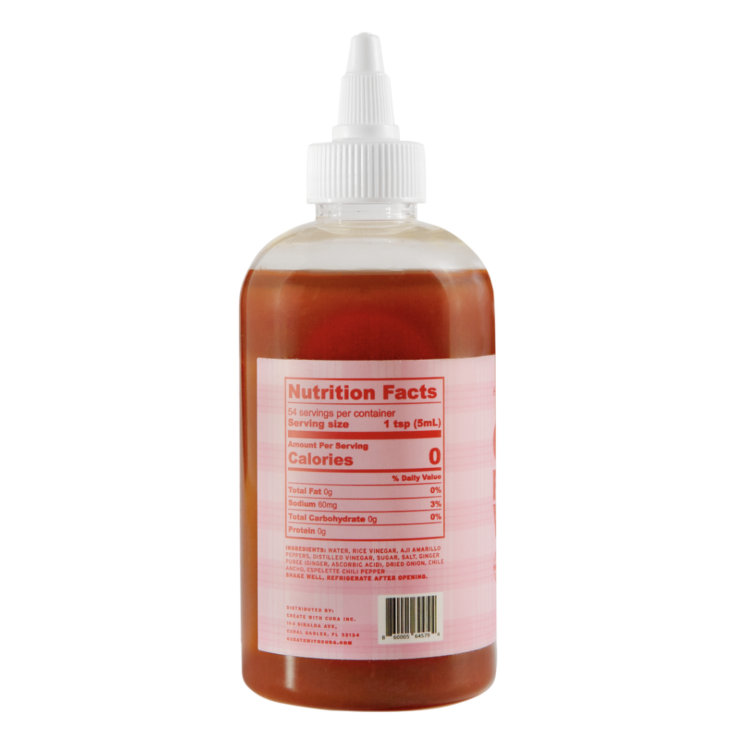 - Ingredients: Rice Vinegar, Distilled Vinegar, Aji Amarillo, Peppers, Onion, Sugar, Sea Salt, Ginger, Ancho Pepper, Espelette Peppers