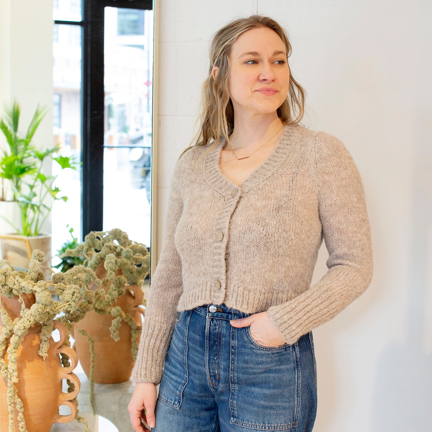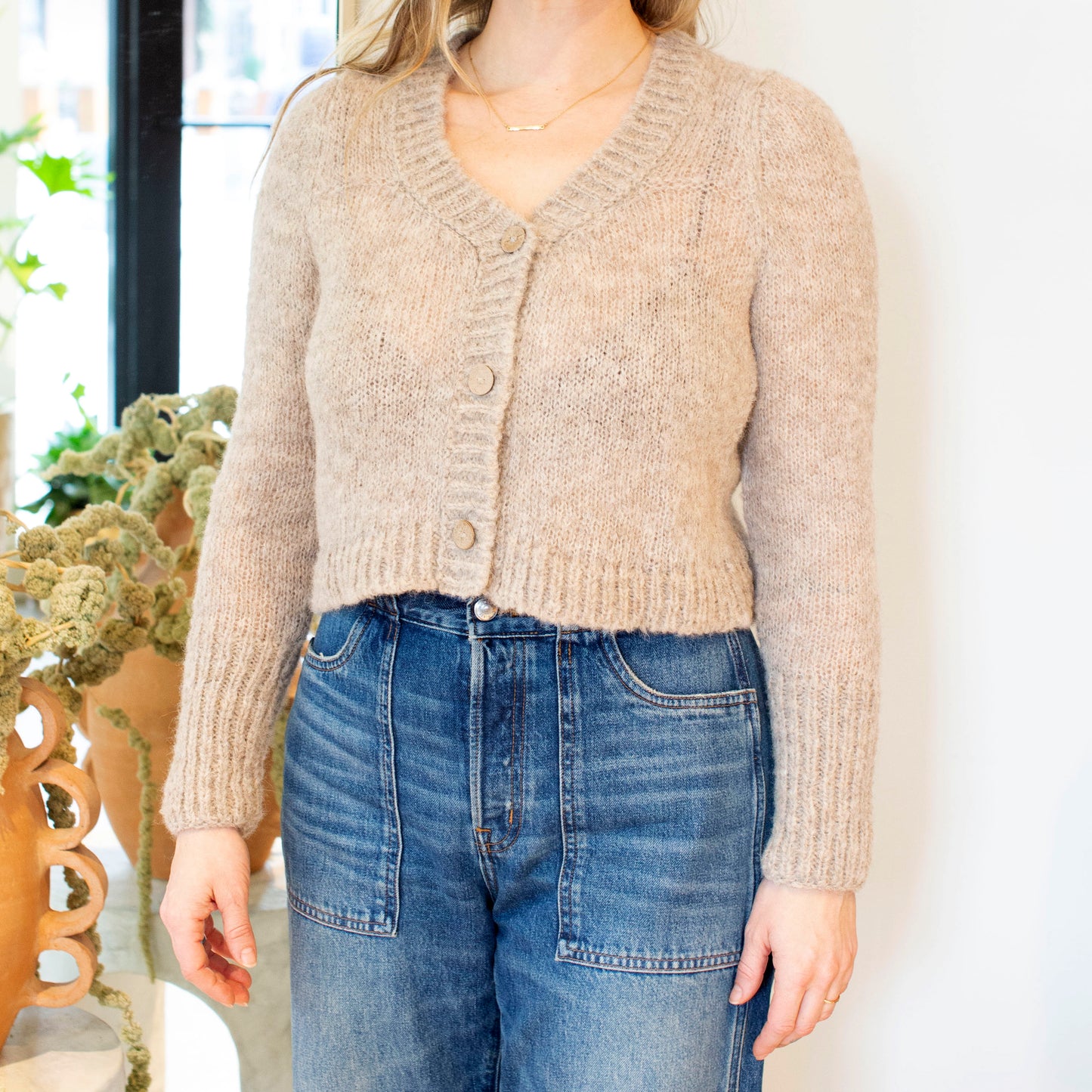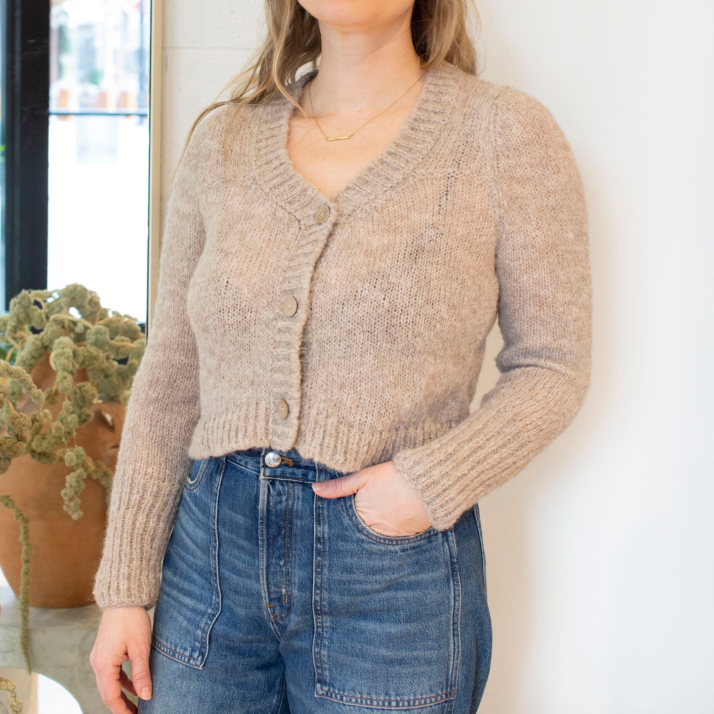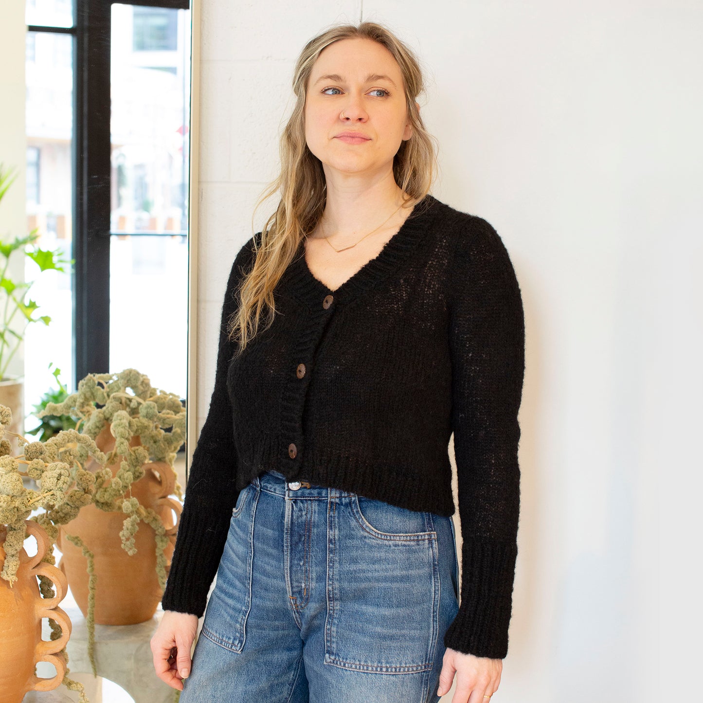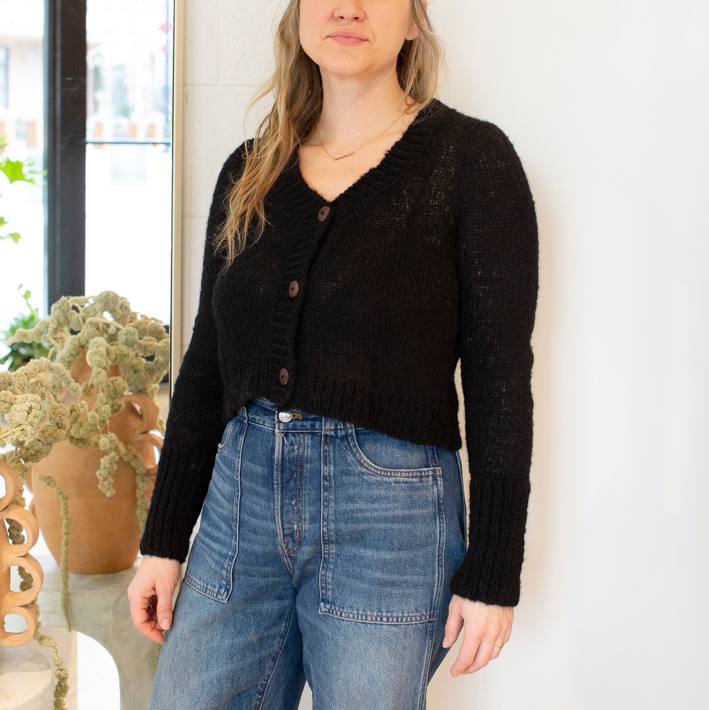 May your cropped cardigan dreams come true! Crocheted with an alpaca wool blend, this super soft sweater is a cold weather go-to.