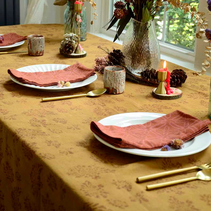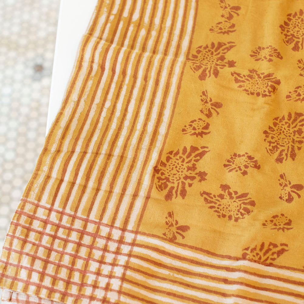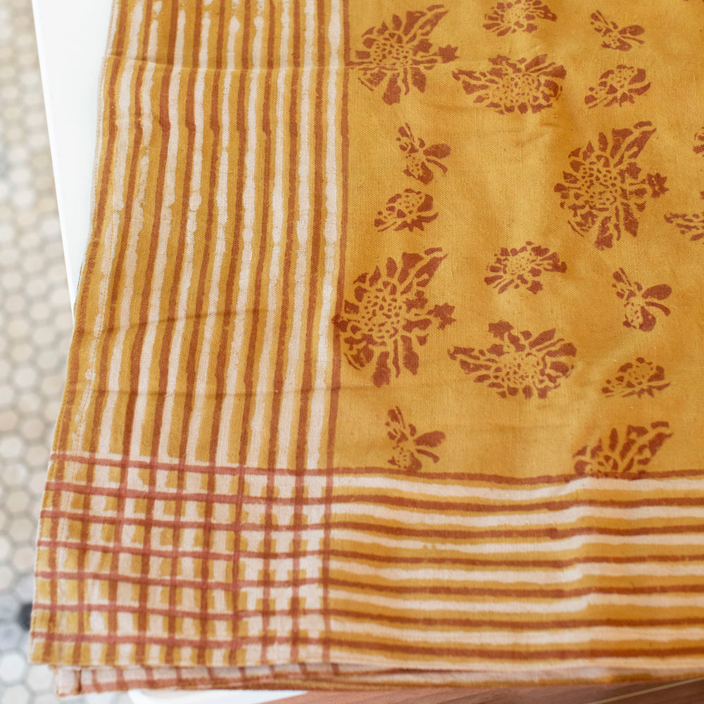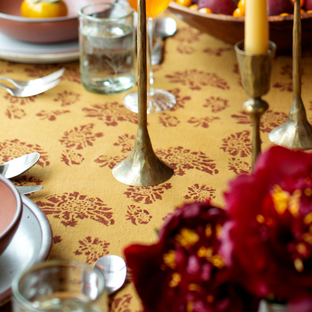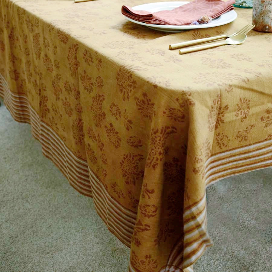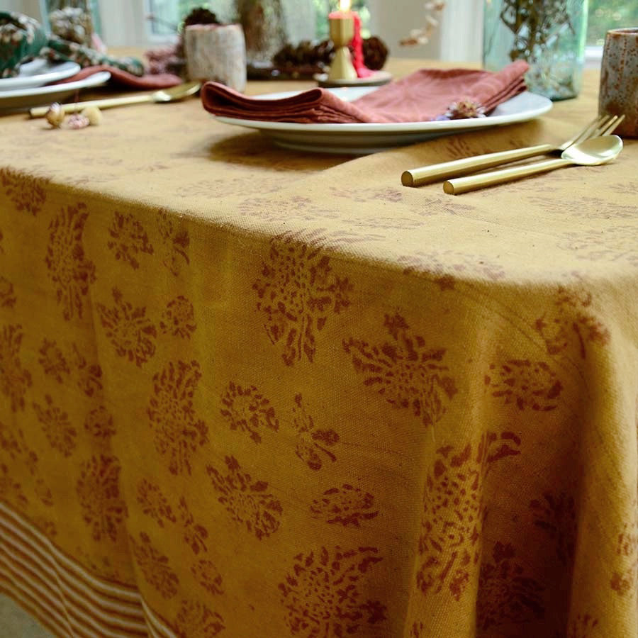 Handwoven and block printed by artisans in India using natural dyes, with a design featuring beautiful marigolds. This tablecloth brings color, craft and tradition to everyday meals or festive gatherings.
