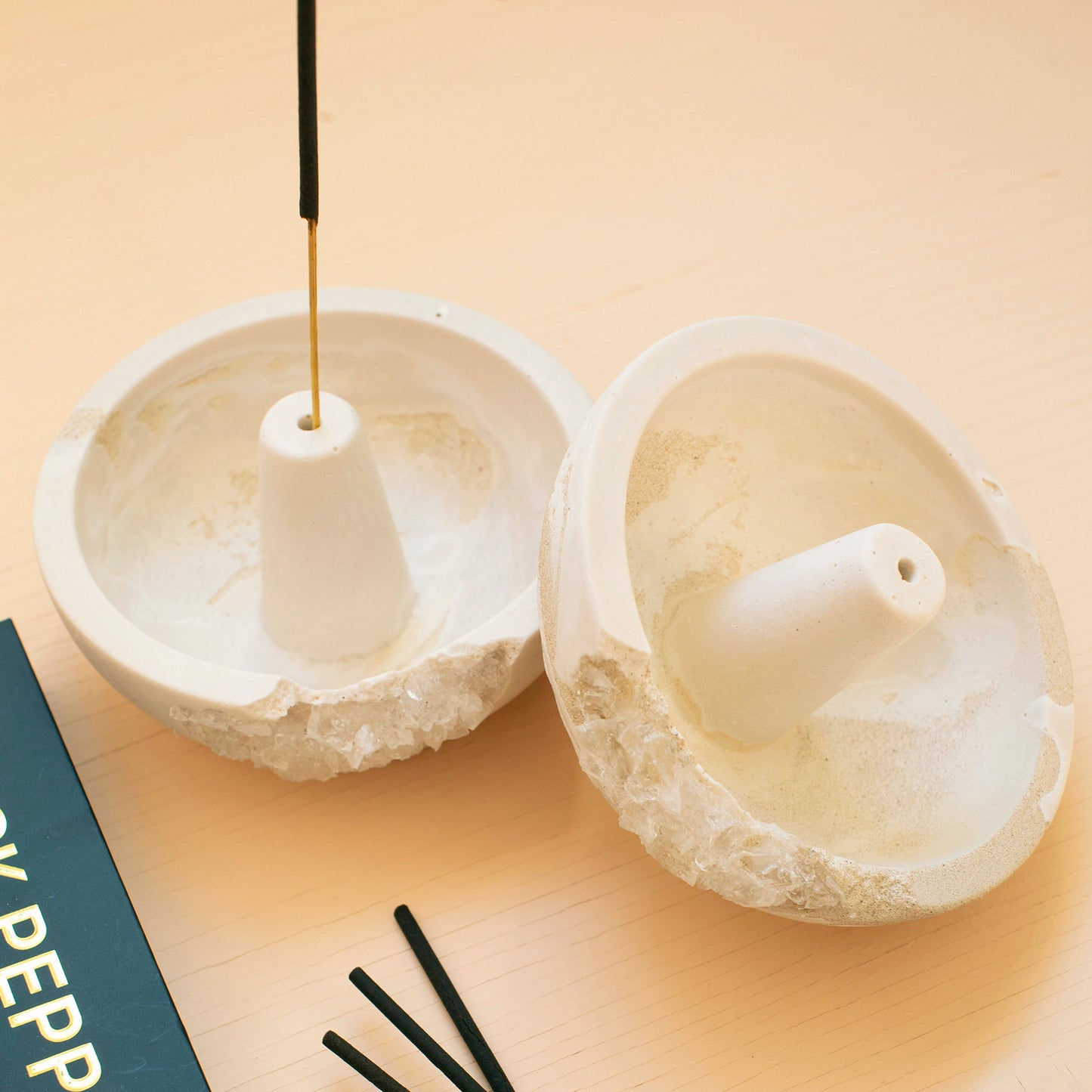 Revitalize your space with this modern incense holder. Its sleek round design is highlighted by a glittering geode and gold leaf detailing.
